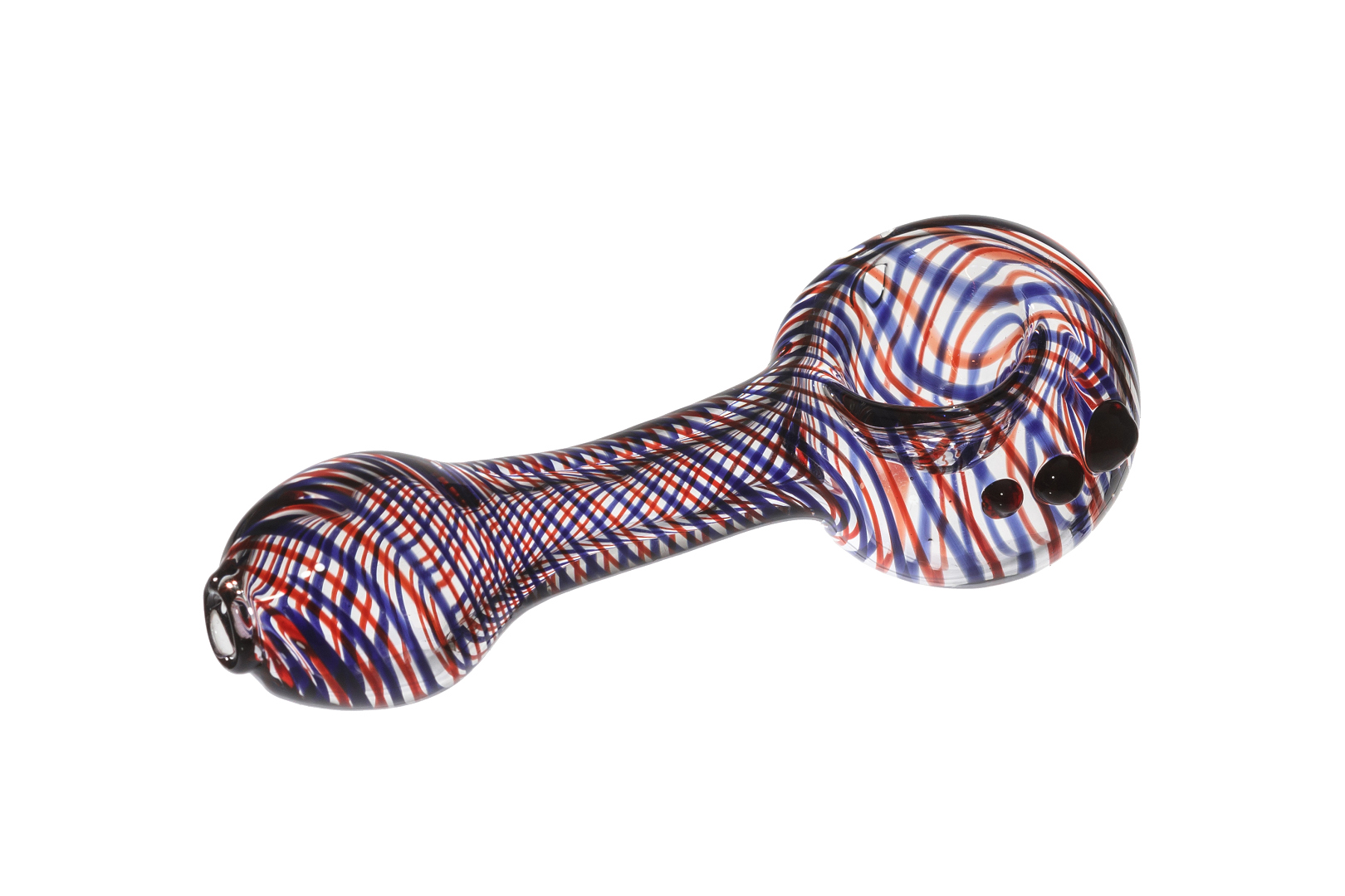Small circus pipe is a handy size pipe from the clear glass decorated with blue and red twisted stripes.